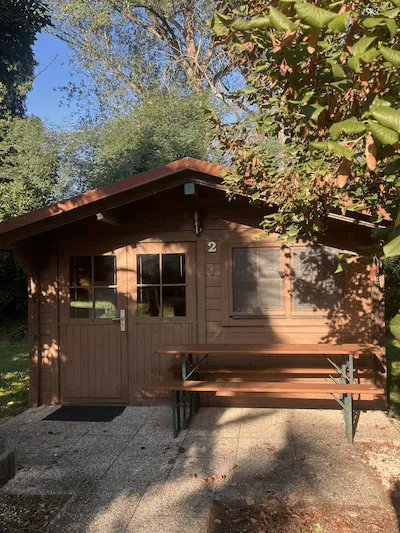 Blockhaus mit 4 Schlafplätzen (2 Stockbetten), mit Kühlschrank, Klimaanlage und Sitzgelegenheit im Freien.