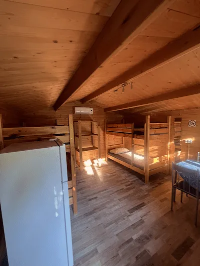 Blockhaus mit 3 Schlafplätzen (Stockbett + Einzelbett), ausgestattet mit Kühlschrank und Klimaanlage.