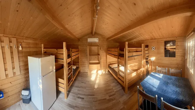 Blockhaus mit 4 Schlafplätzen (2 Stockbetten), ausgestattet mit Kühlschrank, Esstisch und Klimaanlage.